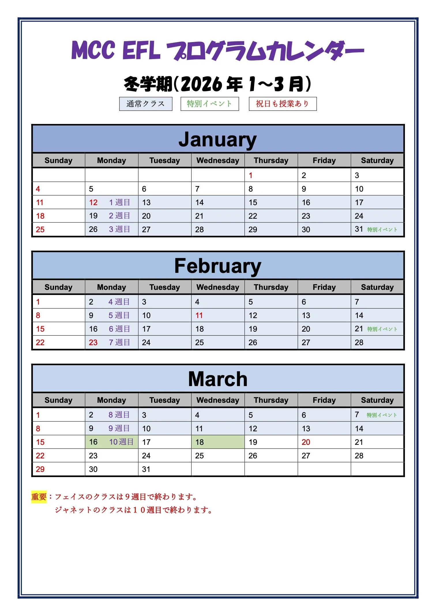 冬学期 (2026年1~3月)